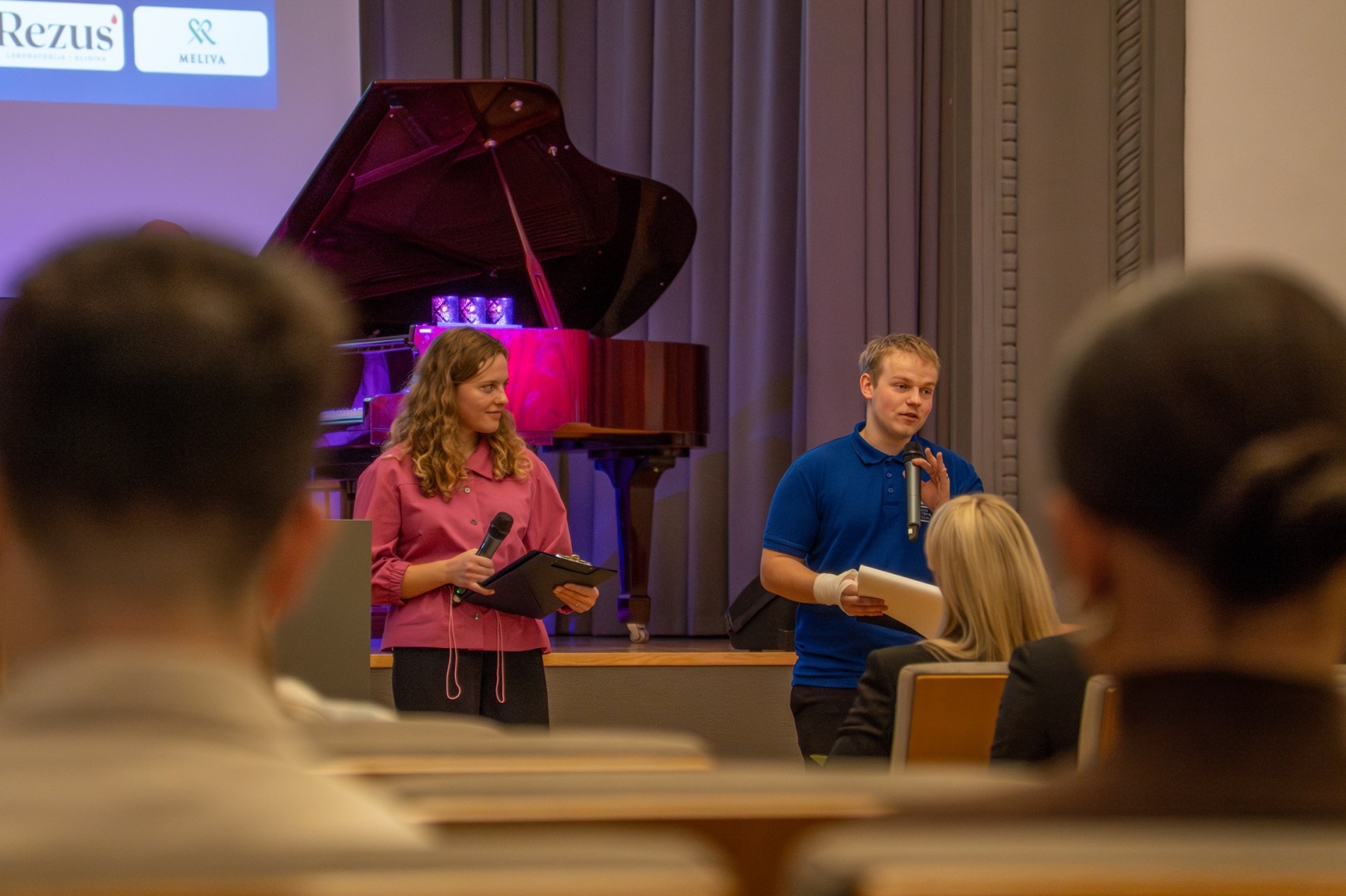 Susitikimo vedėjos – Kolegijos alumnės Augustina ir Viktorija – kalbino Sveikatos priežiūros fakulteto dekanę dr. Liną Garšvę bei Verslo ir technologijų fakulteto dekanę Eriką Jonuškienę. Dekanės papasakojo, kaip mecenatų parama prisideda prie studentų galimybių didinimo, pateikė įdomių skaičių apie mecenatų skiriamos paramos dydžius.