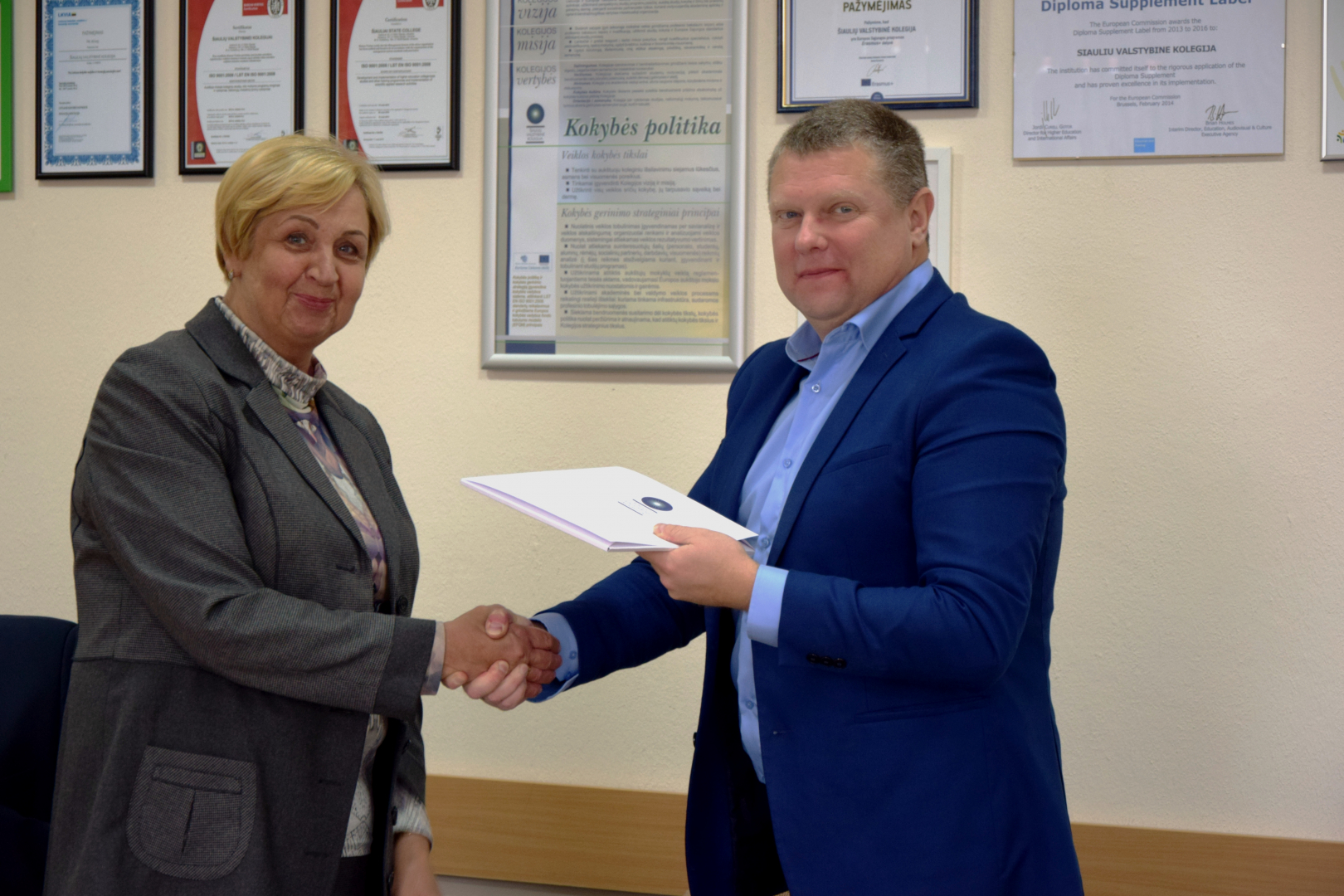 Kompetencijų pripažinimo sutartis mūsų kolegijoje pasirašyta pirmą kartą – tai dviejų švietimo įstaigų produktyvaus bendradarbiavimo rezultatas. Dokumentą savo parašais patvirtinę Šiaulių valstybinės kolegijos direktorė dr. Natalija Šedžiuvienė ir laikinai einantis direktoriaus pareigas Dainius Žukauskas džiaugėsi, kad ši sutartis padės Biržų technologijų ir verslo mokymo centro moksleiviams lengviau siekti aukštojo mokslo diplomo.