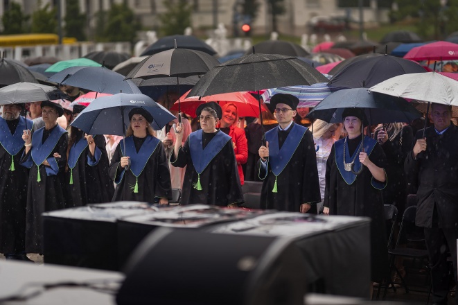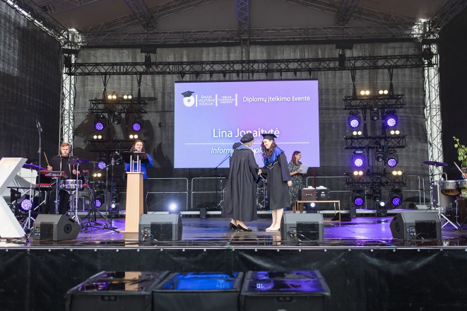 Šiaulių valstybinės kolegijos diplomų įteikimo šventė šiemet surengta pačiame miesto centre, Prisikėlimo aikštėje. Aukštąjį išsilavinimą liudijantys diplomai įteikti 342 asmenims.
