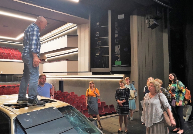 Teatro vadovas Aurimas Žvinys ekskursijos dalyviams papasakojo teatro istoriją, pasidalijo įsimintinais aktorystės momentais, netikėtais nutikimais spektaklių metu.
