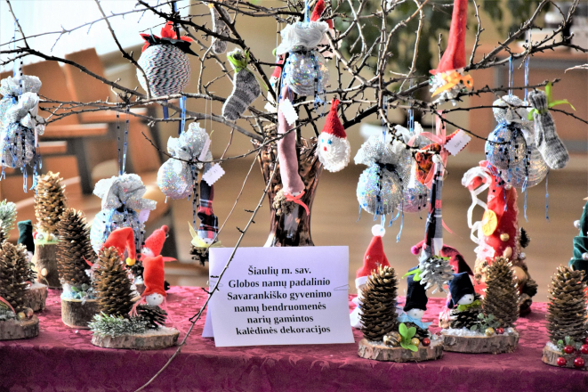 Gruodžio 3 d. vykusiame renginyje „Popietė su šokiais, dainomis ir pokalbiais“ buvo galima pasigėrėti Šiaulių miesto savivaldybės globos namų padalinio savarankiško gyvenimo namų bendruomenės narių gamintomis kalėdinėmis dekoracijomis, įsigyti šventinių rankų darbo grožybių.