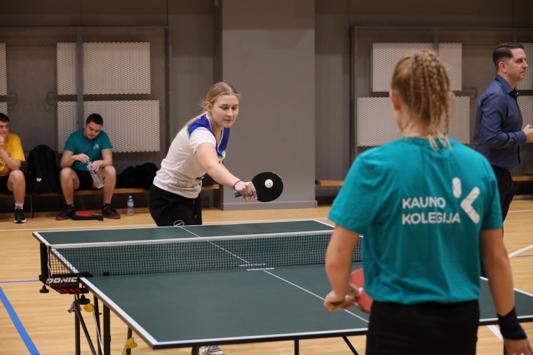 Mūsų aukštosios mokyklos merginos po įnirtingų kovų, tik 1 tašku nusileidusios Vilniaus kolegijos tenisininkėms, iškovojo II vietą ir džiaugėsi sidabro medaliais. Pirmoji vieta atiteko Vilniaus kolegijos stalo tenisininkėms, Kauno kolegijos merginos liko trečioje vietoje.