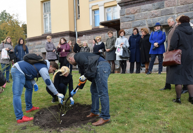 Kuriamame Chaimo Frenkelio vilos rožyne susirinkę Šiaulių valstybinės kolegijos dėstytojai ir kiti darbuotojai pedagogų profesinės šventės proga pasodino Mme Knorr veislės rožių krūmą.