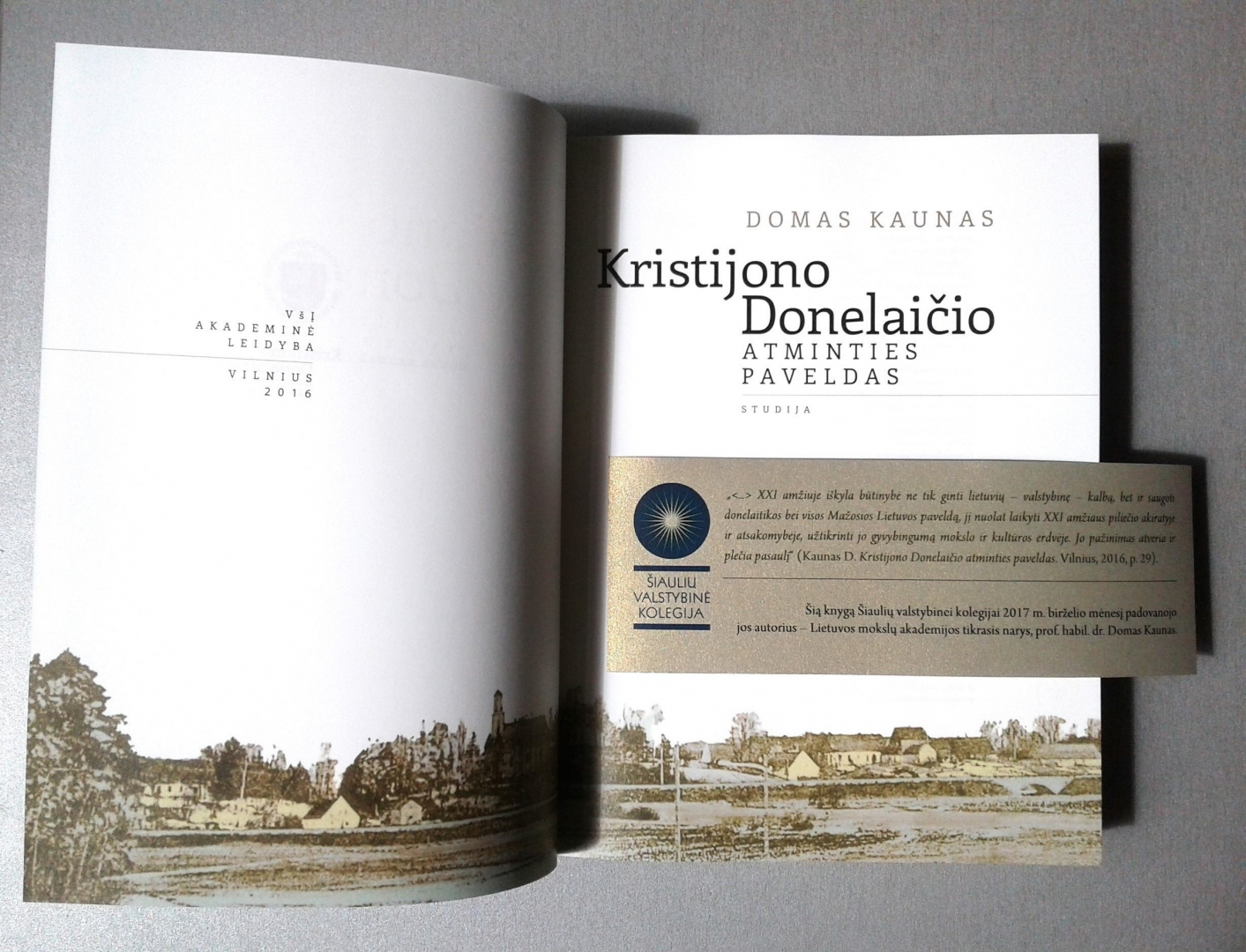 Lietuvos mokslų akademijos tikrasis narys, prof. habil. dr. Domas Kaunas Šiaulių valstybinei kolegijai padovanojo naujausią savo studiją „Kristijono Donelaičio atminties paveldas".