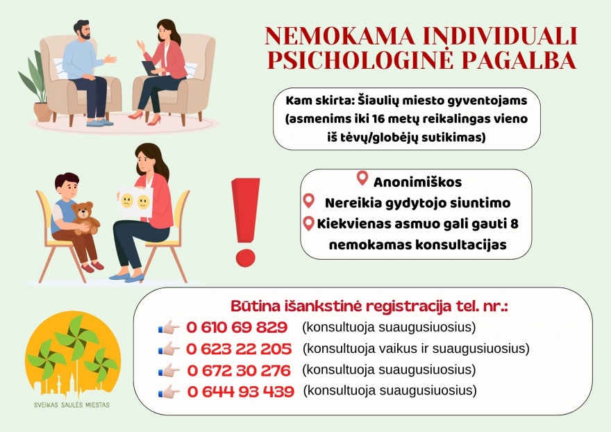 Šiaulių miesto visuomenės sveikatos biuras „Sveikas saulės miestas“ teikia psichologo konsultacijas Šiaulių miesto gyventojams (asmenims iki 16 metų reikalingas vieno iš tėvų ar globėjų sutikimas). Sutikimą parašykite laisva forma ir registruojantis įkelkite sutikimo nuotrauką.
